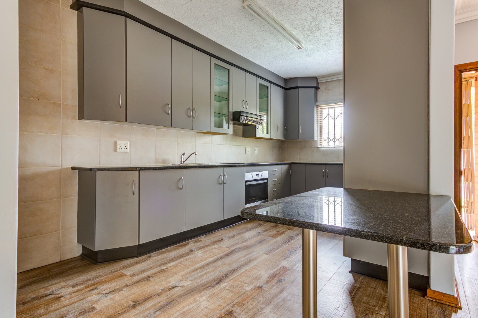 The well-appointed kitchen is a highlight, boasting extensive grey cabinetry, dark granite countertops, and a practical tiled backsplash. It comes equipped with an integrated oven and hob, along with a convenient breakfast bar, making meal preparation and casual dining a breeze. Each of the three bedrooms features practical built-in wardrobes, ensuring ample storage and a tidy living space. The two bathrooms are designed for everyday comfort.