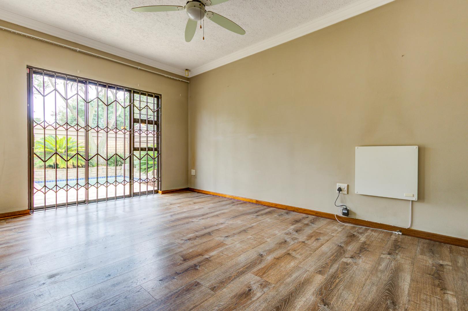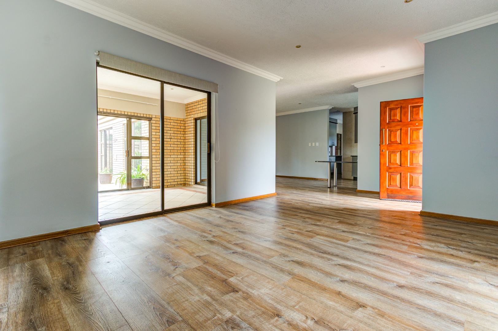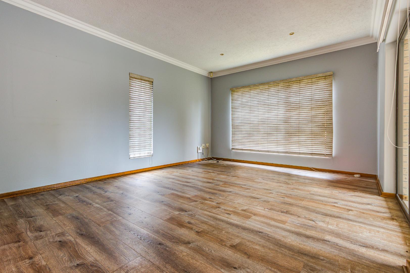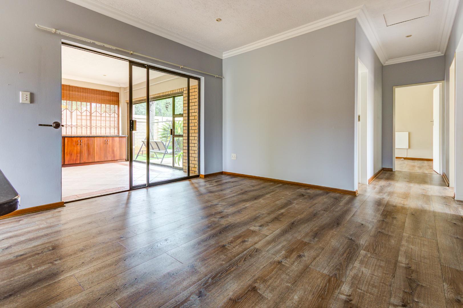 This inviting 3-bedroom, 2-bathroom residence offers comfortable living within a secure estate in Bartlett. Step inside to discover a spacious layout featuring modern wood-look laminate flooring and neutral light grey walls, creating a bright and welcoming atmosphere. The open-plan lounge and dining room provide ample space for relaxation and entertaining, benefiting from abundant natural light and recessed ceiling lights. An ornate wooden front door adds a touch of character, while a large sliding glass door seamlessly connects to an enclosed sunroom or patio, perfect for enjoying the South African climate.