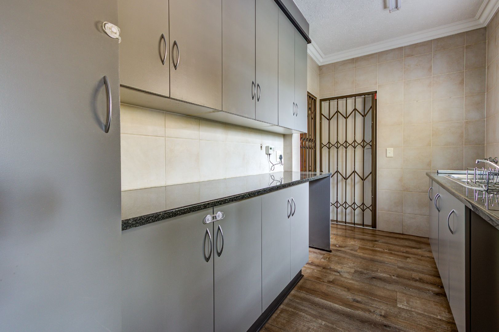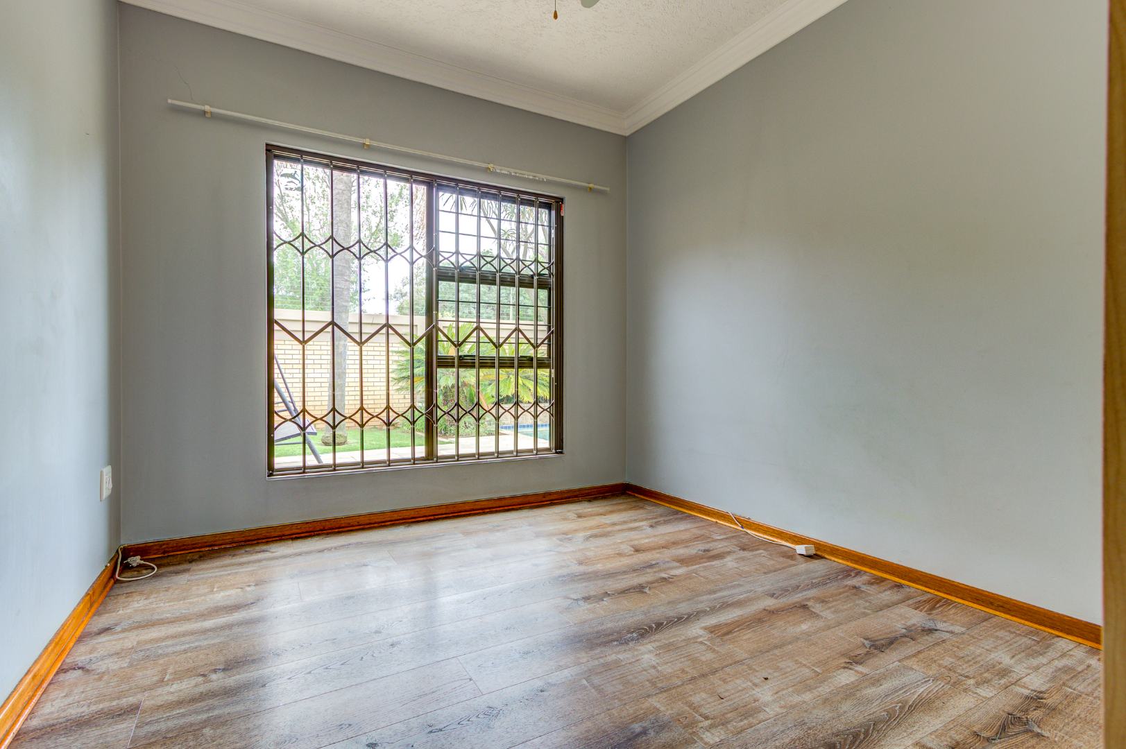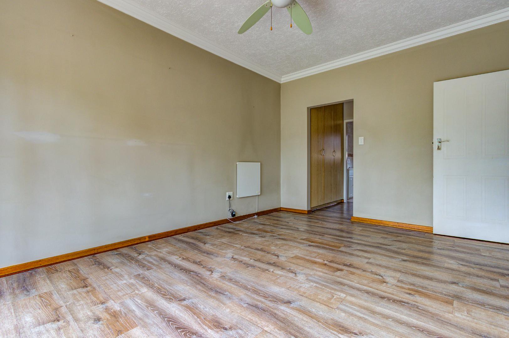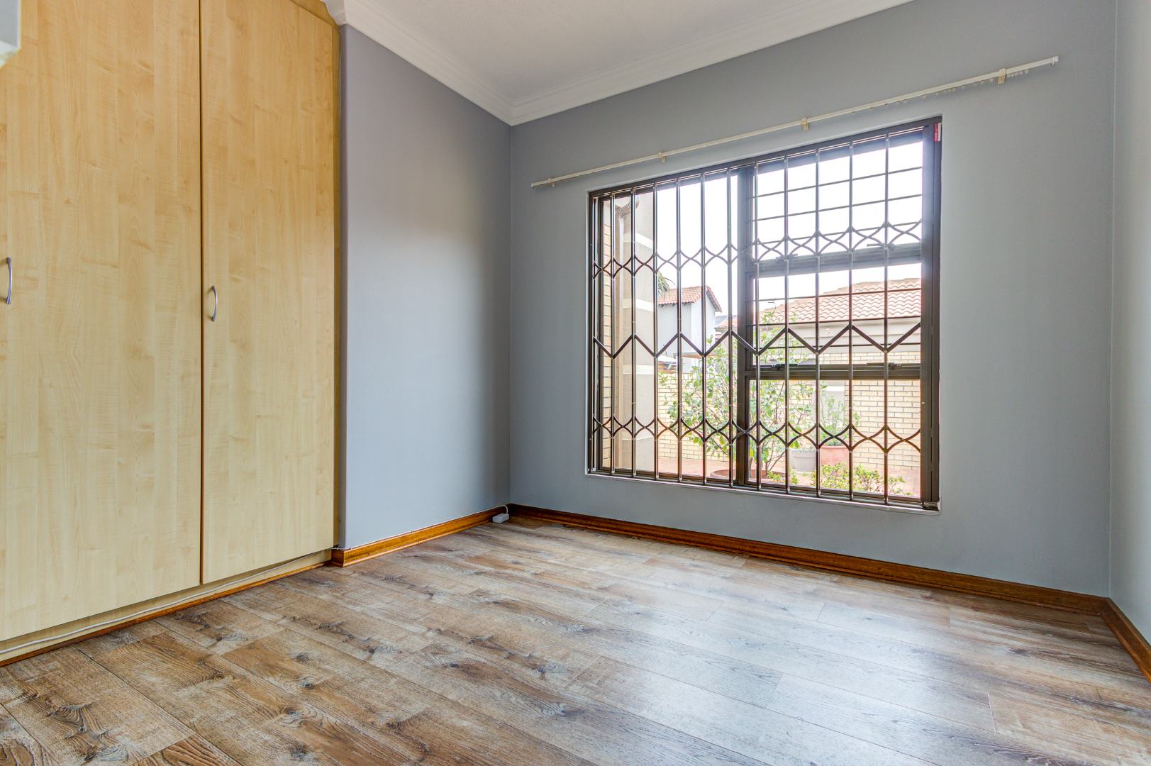 This inviting 3-bedroom, 2-bathroom residence offers comfortable living within a secure estate in Bartlett. Step inside to discover a spacious layout featuring modern wood-look laminate flooring and neutral light grey walls, creating a bright and welcoming atmosphere. The open-plan lounge and dining room provide ample space for relaxation and entertaining, benefiting from abundant natural light and recessed ceiling lights. An ornate wooden front door adds a touch of character, while a large sliding glass door seamlessly connects to an enclosed sunroom or patio, perfect for enjoying the South African climate.