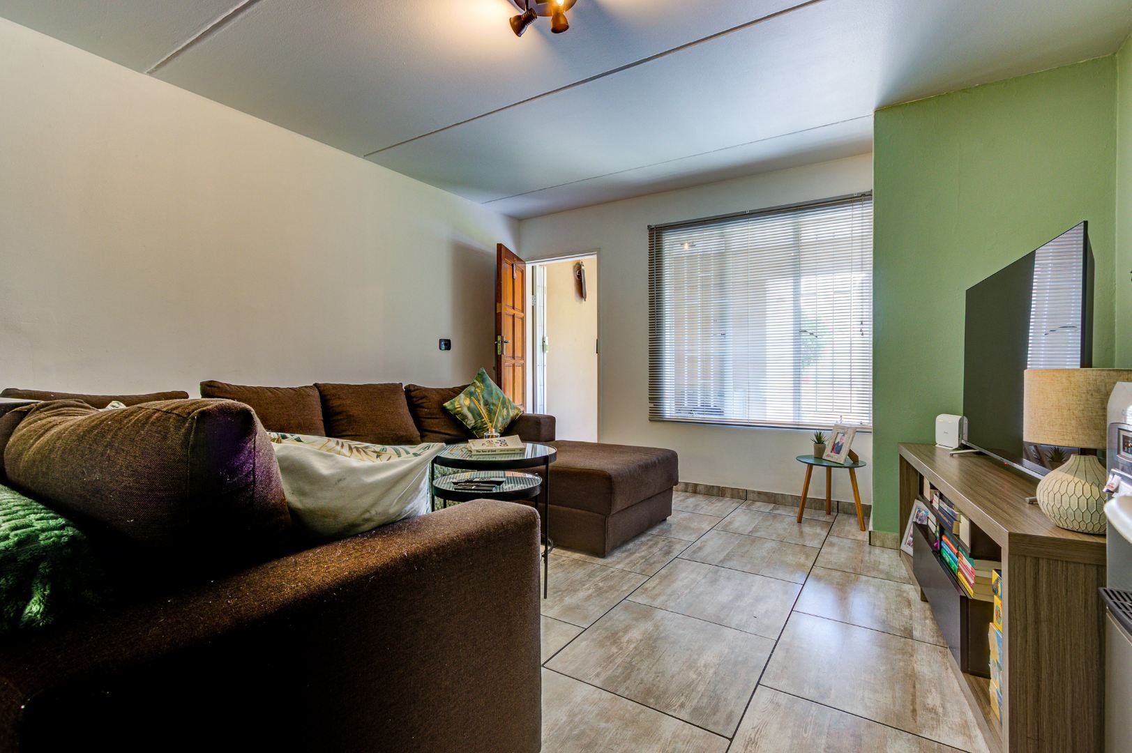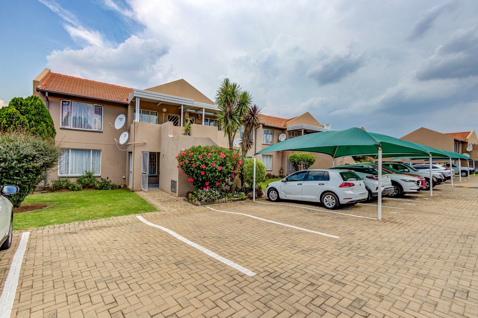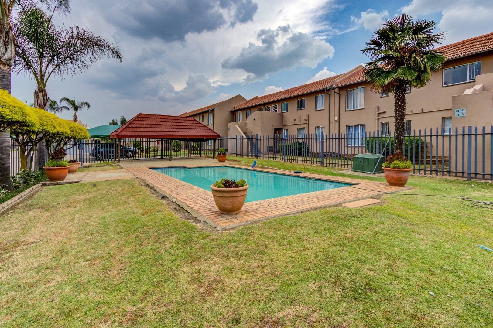Residents of this complex enjoy access to excellent communal amenities designed for relaxation and recreation. These include a well-maintained swimming pool with brick paving, a communal braai area, and pleasant landscaped gardens with green lawns and palm trees. The exterior of the complex presents a neat appearance with light-colored facades and terracotta-style roofs, contributing to its kerb appeal.