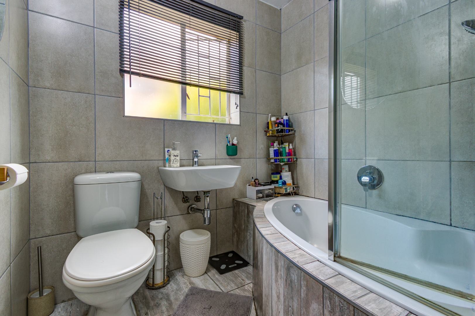 The two bedrooms provide comfortable accommodation, complemented by a contemporary bathroom. This bathroom boasts modern grey tiling on both walls and floor, a bathtub with an integrated shower and glass enclosure, and a wall-mounted basin, all benefiting from natural light via a window with privacy blinds.