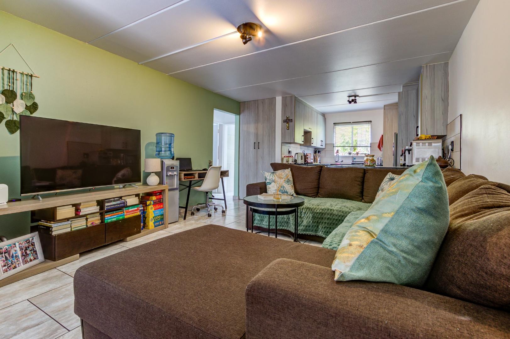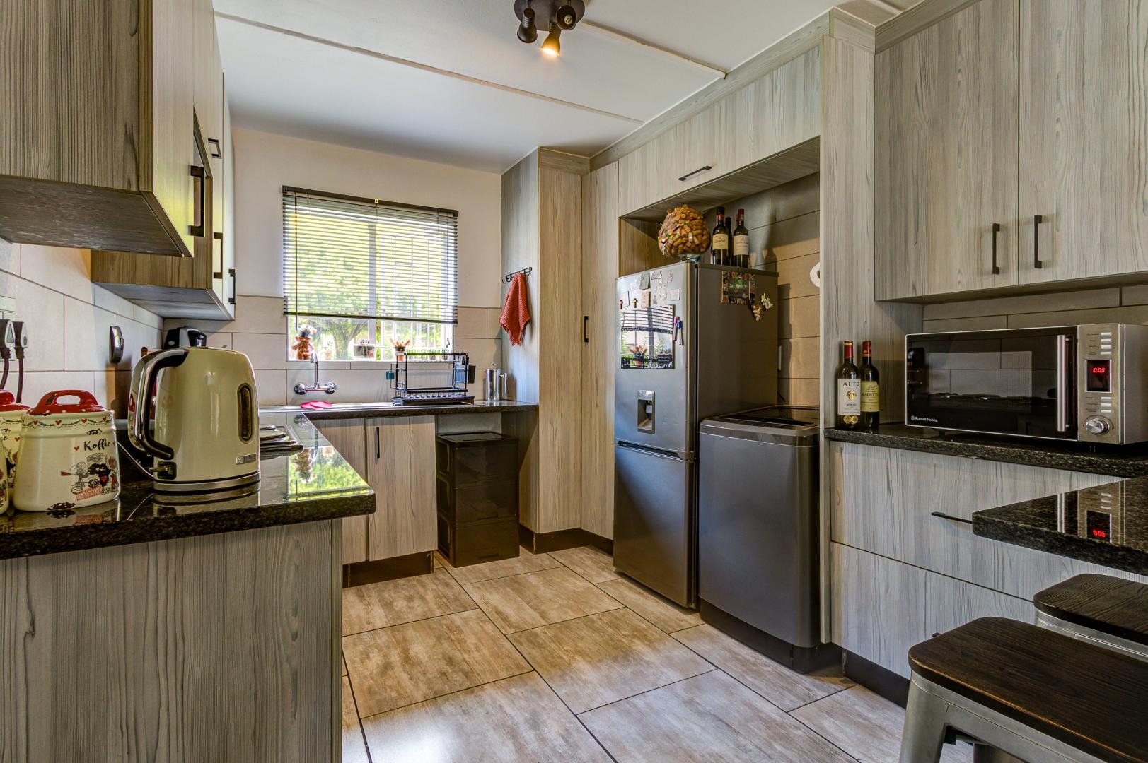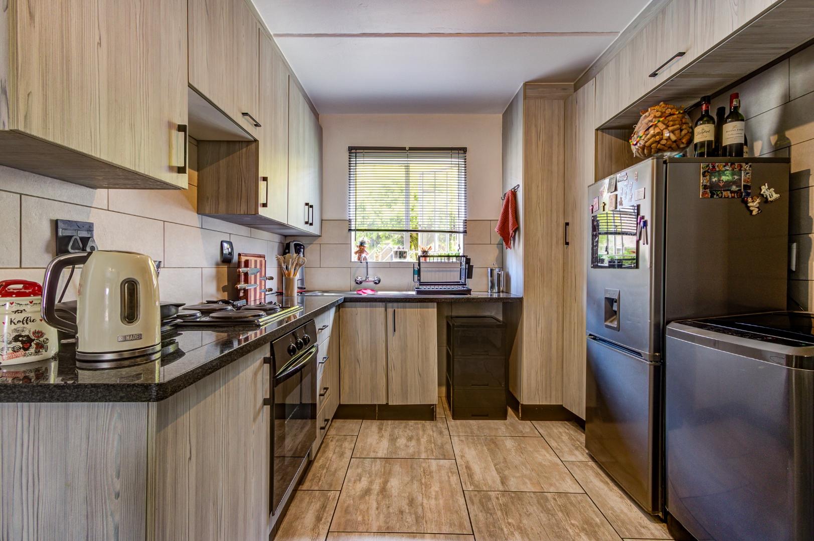 Discover comfortable living in this well-appointed 2-bedroom, 1-bathroom apartment located within a secure complex in Beyers Park, Boksburg. Spanning 64.00 sqm, this residence offers a practical and inviting open-plan layout, seamlessly connecting the living area with a modern kitchen. The kitchen is a highlight, featuring light wood-grain cabinetry, dark granite-style countertops, an integrated oven and hob, and ample space for a large refrigerator and washing machine. Tiled flooring extends throughout the living spaces.