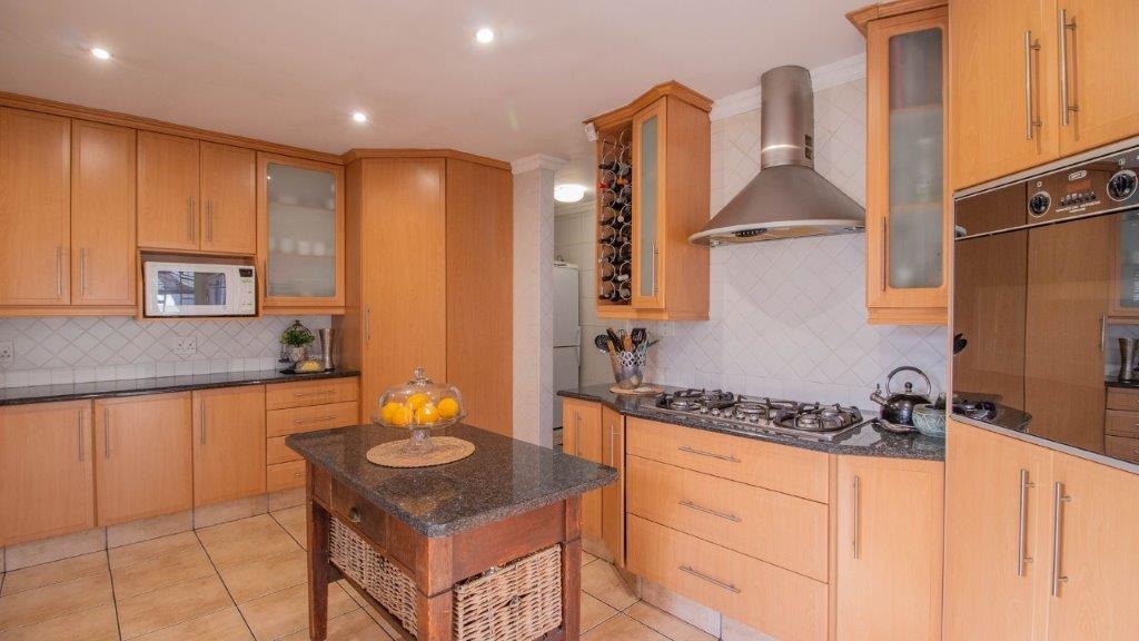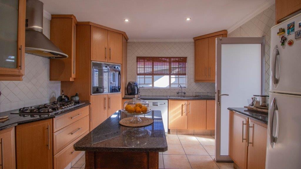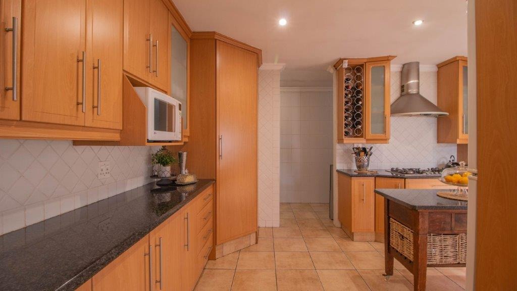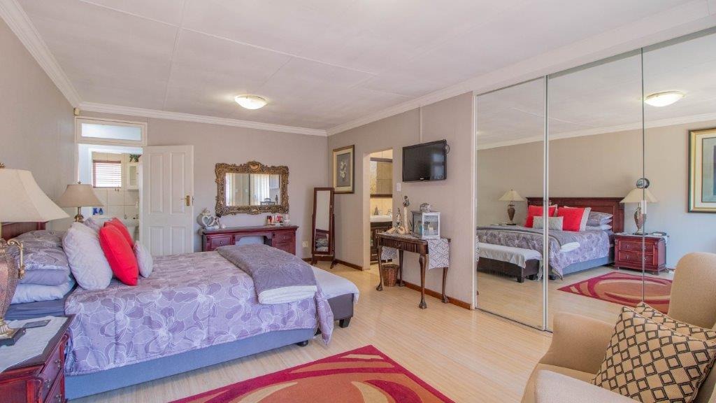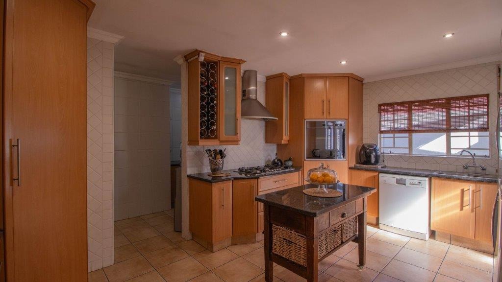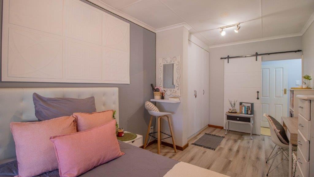 For entertainers, the home offers a stunning entertainment room with a built-in braai and glass doors leading out to an undercover patio that overlooks the sparkling swimming pool—perfect for hosting friends and family all year round.