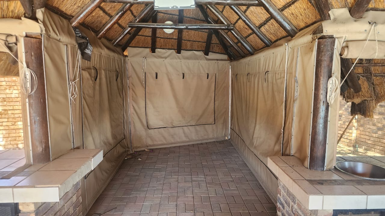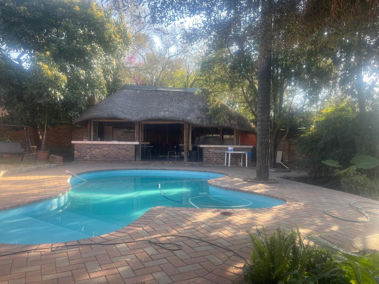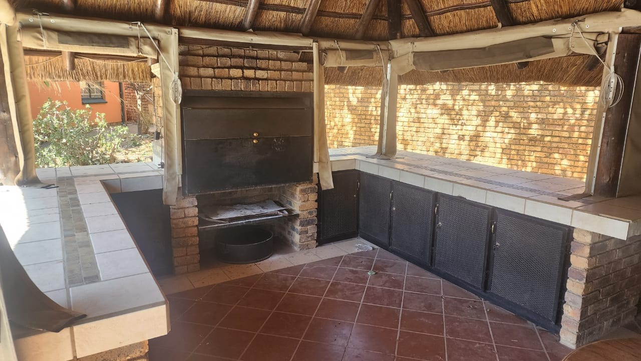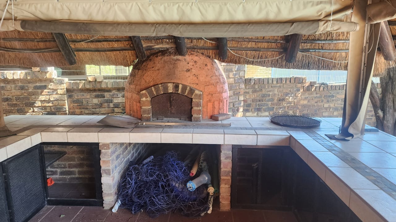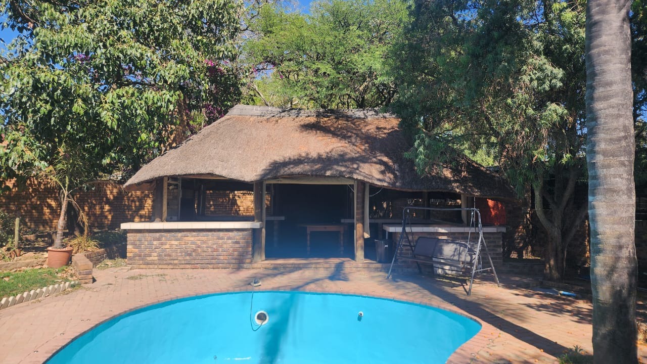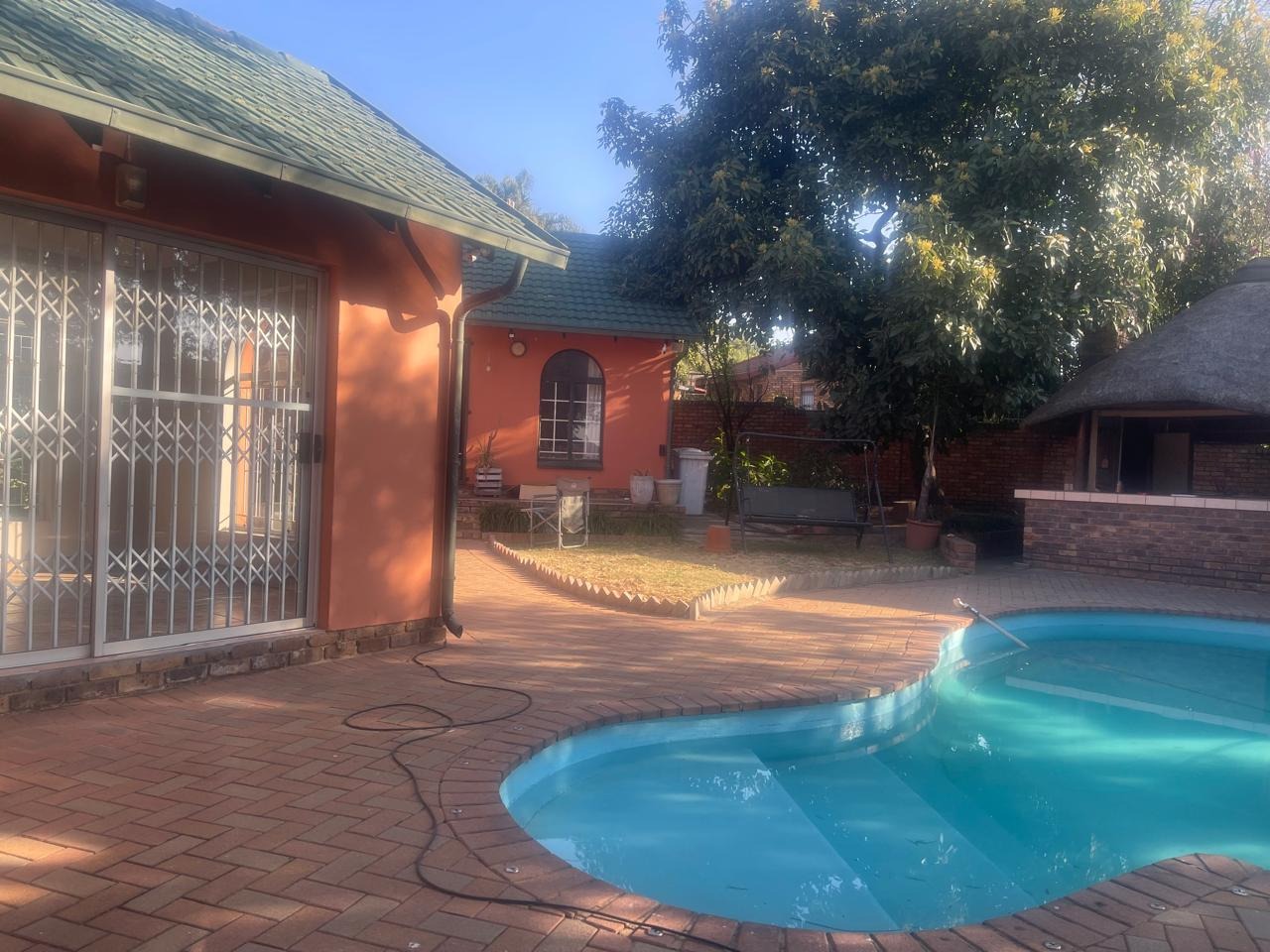 Step outside to a vibrant outdoor oasis, perfect for family living and entertaining. The property features a large, inviting swimming pool complemented by a thatched lapa, complete with a built-in braai and bar area. Extensive brick paving surrounds the pool and entertainment zone, ensuring low maintenance. The distinctive coral-colored exterior and green tiled roof add unique character, while arched windows enhance natural light throughout the home.