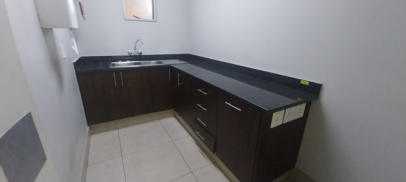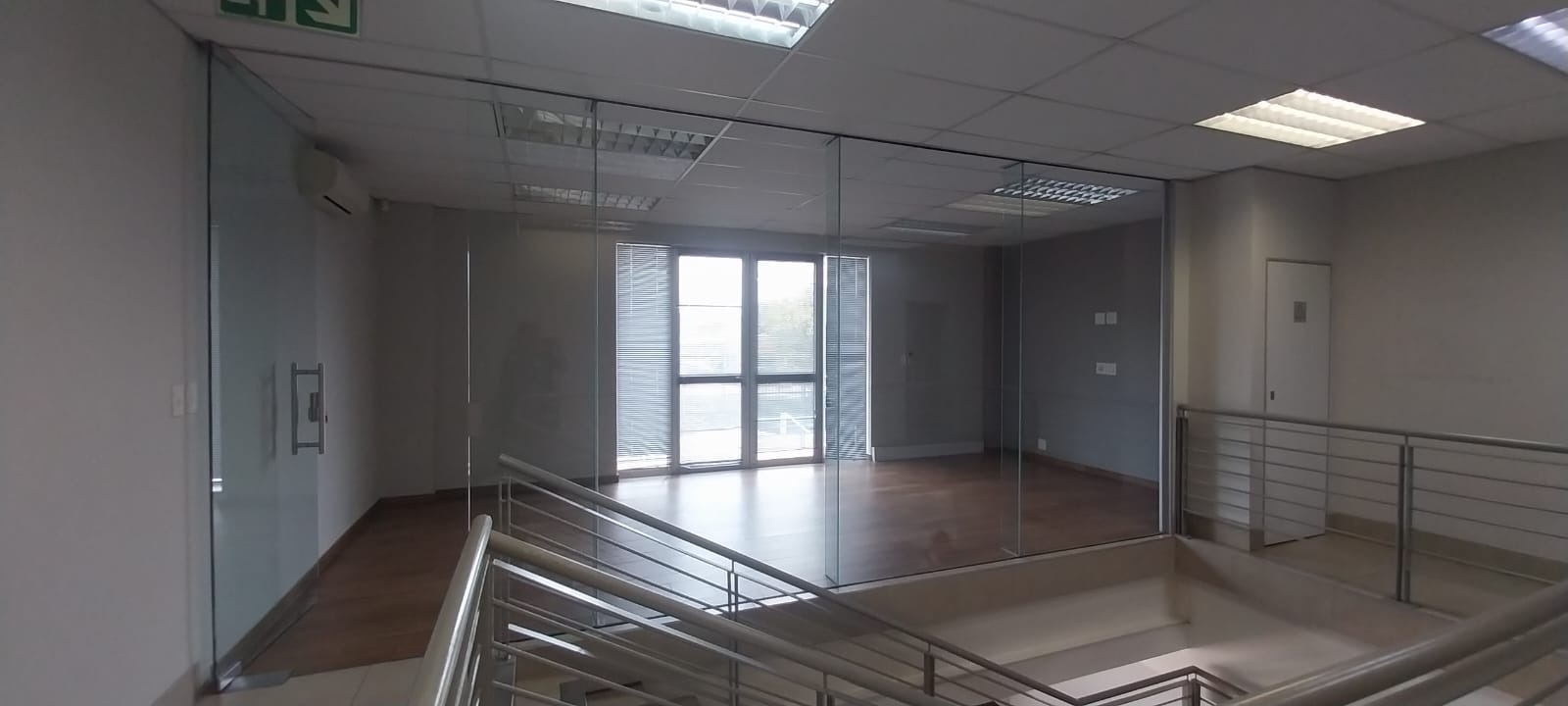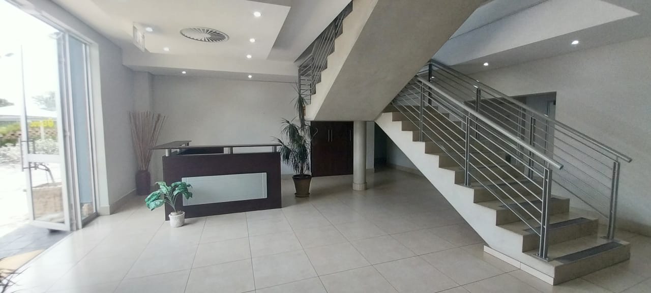 The property features a contemporary two-story red brick office block, offering a professional reception area with sleek finishes, abundant natural light, and a stylish staircase. The adaptable office interiors are designed for immediate tenant fit-out, providing a clean canvas with white walls, mixed flooring, glass partitions, and integrated air conditioning units, complemented by three well-appointed kitchens and three bathrooms.