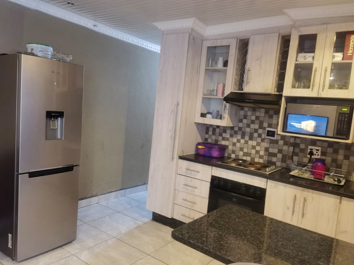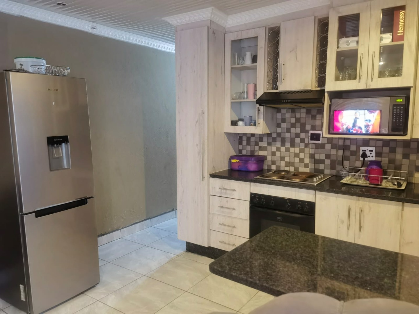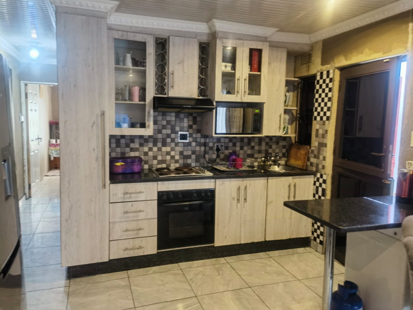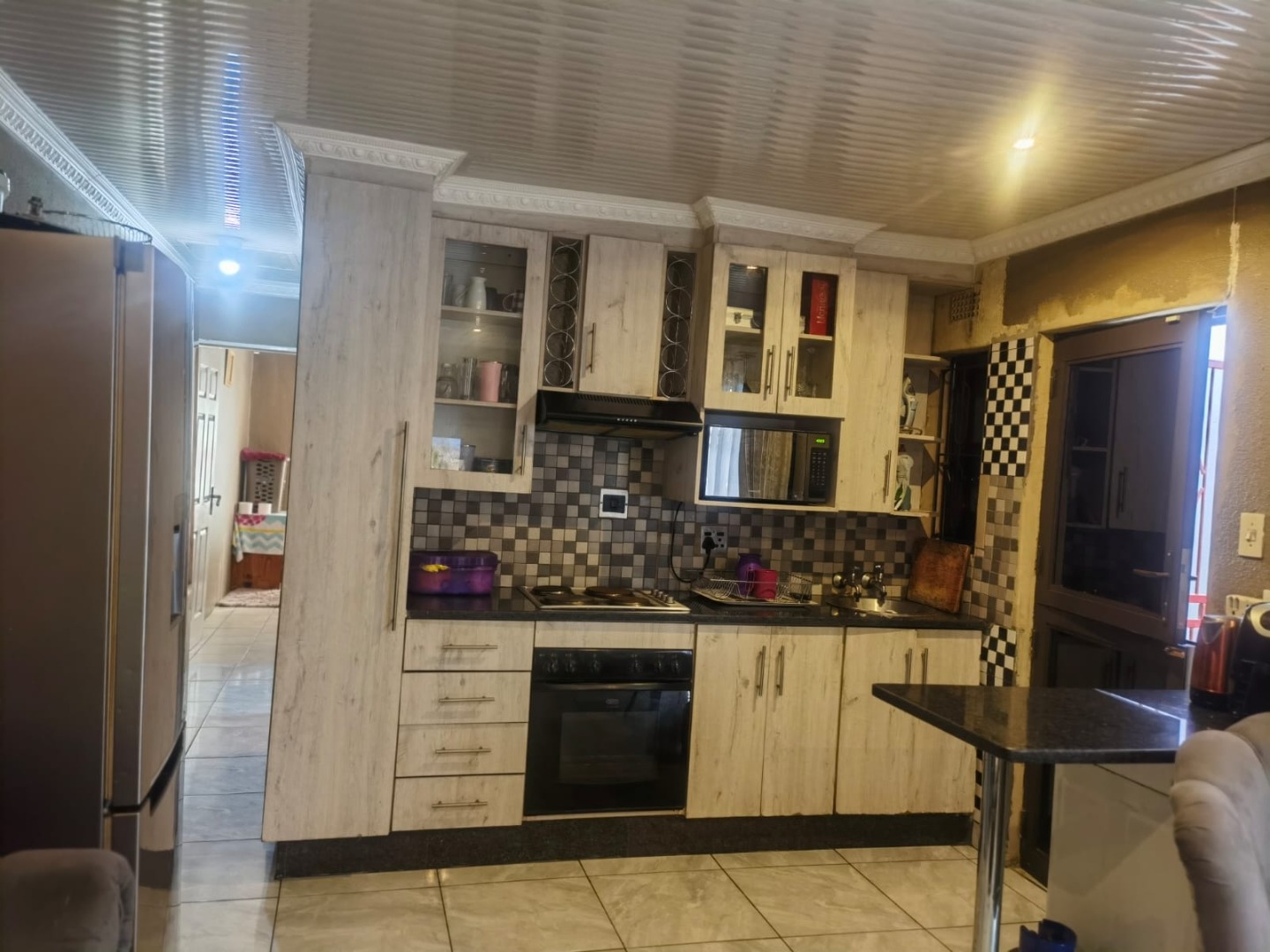The lounge area is spacious and welcoming, providing the perfect place to relax with family or entertain guests. The fitted kitchen is well laid out and offers built-in cupboards with sufficient storage space, making meal preparation convenient and efficient.
