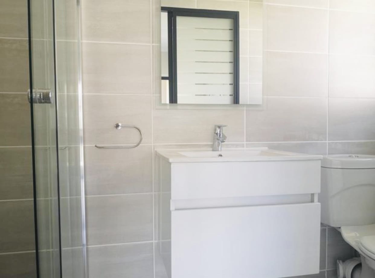 The bedroom includes built-in cupboards with a modern bathroom.