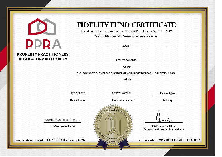 About Salome Leeuw Title: Full Status Property Practitioner Registered with the PPRA FFC Number: 20237148710